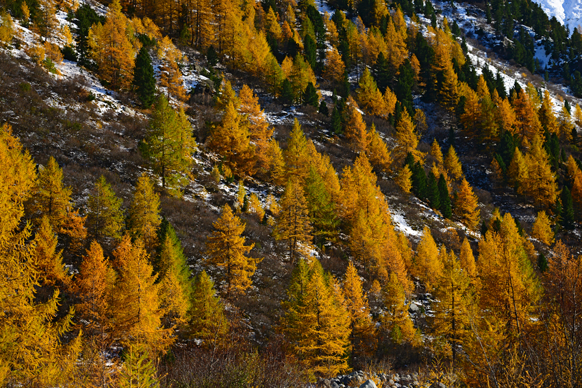 Am meisten neugierig waren wir auf das Val da Camp im Puschlav (Poschiavo), mit dem Lago (oder Lagh) da Saoseo. Als wir jedoch am ersten Tag unseres Aufenthaltes durch die langsam gelb werdenden Lärchenwälder in Richtung SAC-Hütte wanderten, schwand unsere Hoffnung hier noch schöne Spiegelungen ablichten zu können. Die Befürchtung bewahrheitete sich spätestens am Ufer das Saoseo, denn hier langen rund 25cm Neuschnee und die Wasseroberfläche präsentierte sich uns völlig zugefroren. Was für ein Frust...